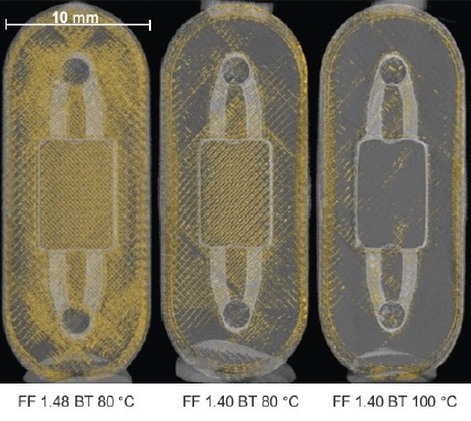 Die Abbildung zeigt die dreidimensionale Ansicht von drei Zellkulturbehältern. Die gelb gefärbten Bereiche markieren die Poren in den Testproben. In der Mitte des Bildes sind die integrierten Strukturen deutlich zu erkennen. Es ist deutlich zu erkennen, dass ein niedriger Formfaktor und eine hohe Temperatur in der Baukammer zu einer Verringerung des Porenvolumens führen.